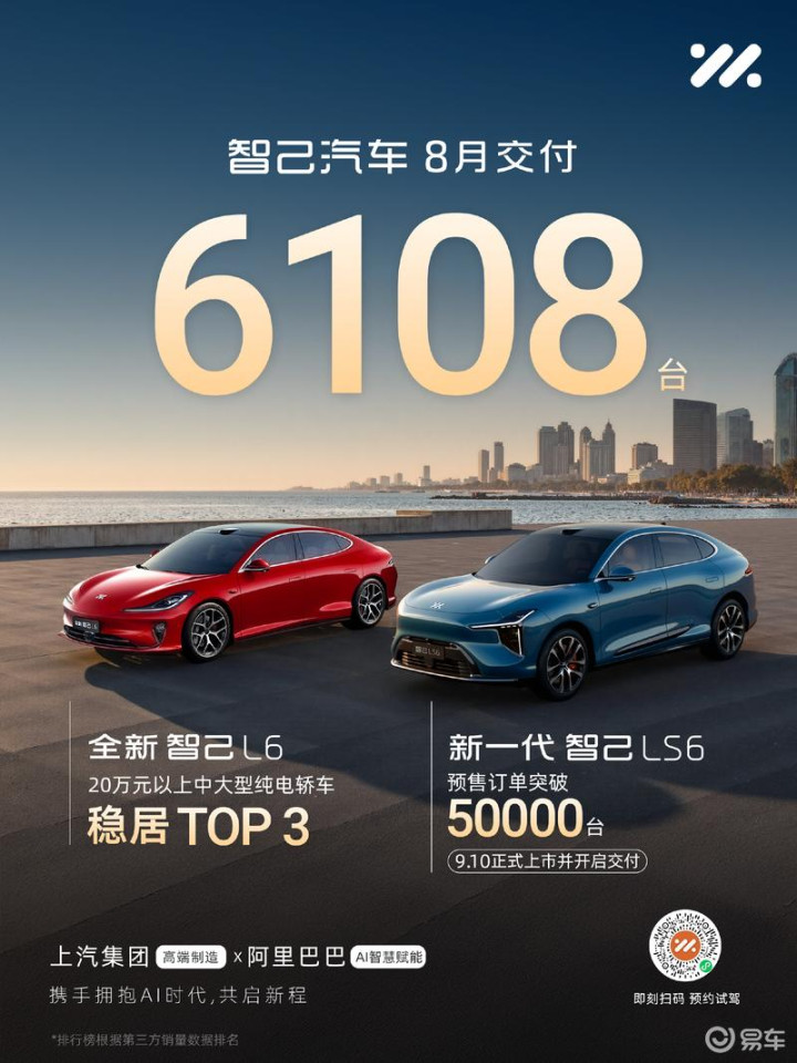 易车讯9月1日,智己汽车公布最新销量数据,8月交付6108台。新一代智己LS6自8月15日开启预售以来,小订已破5万台,新车将于9月10日正式上市。
